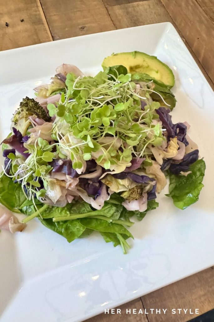 - Lots of leafy greens like spinach, arugula, and kale – I add to green juices and salads. Lets just say, greens, greens and more greens. Whatever raw greens, sprouts, and microgreens I can get in on a given day, the better.
