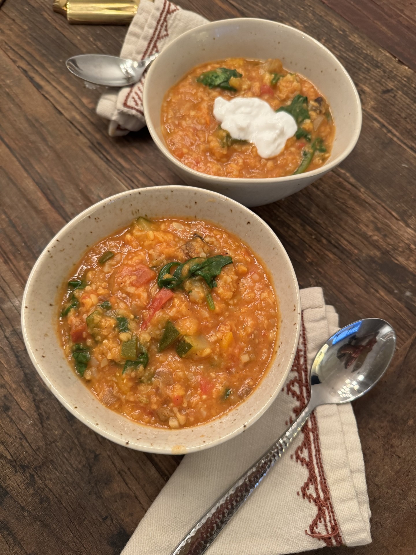 Indian food is one of my top favorite cuisines and my absolute top favorite during the Fall and Winter. Mark and I used to frequent a local Indian restaurant once a week before I started cutting out dairy and extra crappy oils on the norm. Last year however we were missing those Indian meals and went back after years of not going. We were looking to bring back those good memories and feel some joy. Sadly though, the food just tasted like canola oil and we couldn’t get passed it. Oh well, we still cherish the past memories, but I realized then I needed to learn to cook some more Indian dishes at home. While Ri’s Kitchari (Kitchari is an Ayurvedic dish) is not the type of Indian we ate at these restaurants, it has Moong Daal lentils and Indian spices that give us those similar, warming, feel-good feelings. Moong Daal lentils are one of the few legumes recommended for the Vata dosha type (me) as well as being a good one for all dosha types (Vata, Pitta, and Kapha) in Ayurveda. I think it’s the perfect mix of a hearty lentil soup that sneaks in a good bit of veggies and Indian spices. I look forward to having this warm hug for dinner often.